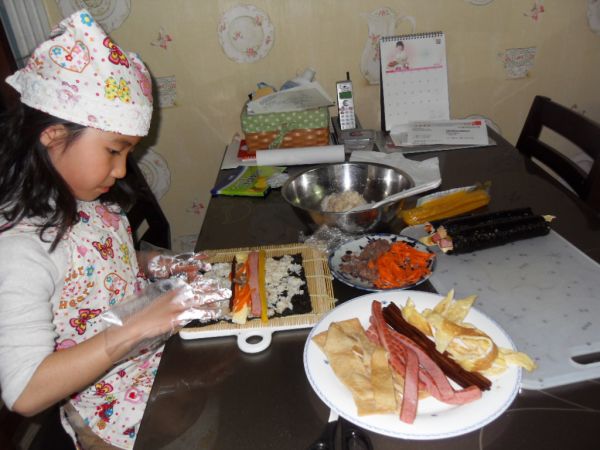 공주님이 아빠 점심 준비하고 있내요.